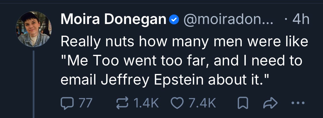 There are many journalists still combing through and providing proper analysis of the latest file release. And I recognize that this is all only part of the fuckery and authoritarian abuse from these past few weeks. You don’t need much more from lil old me on it other than maybe a good chin-up message.